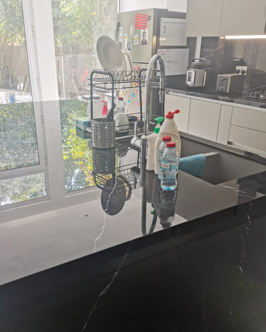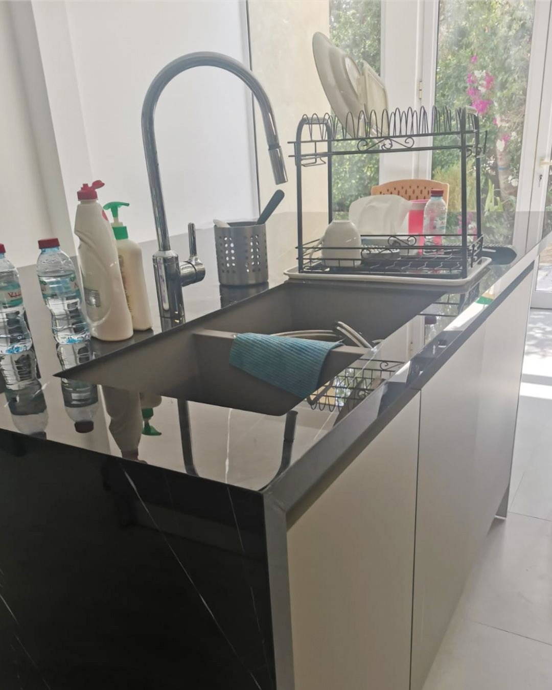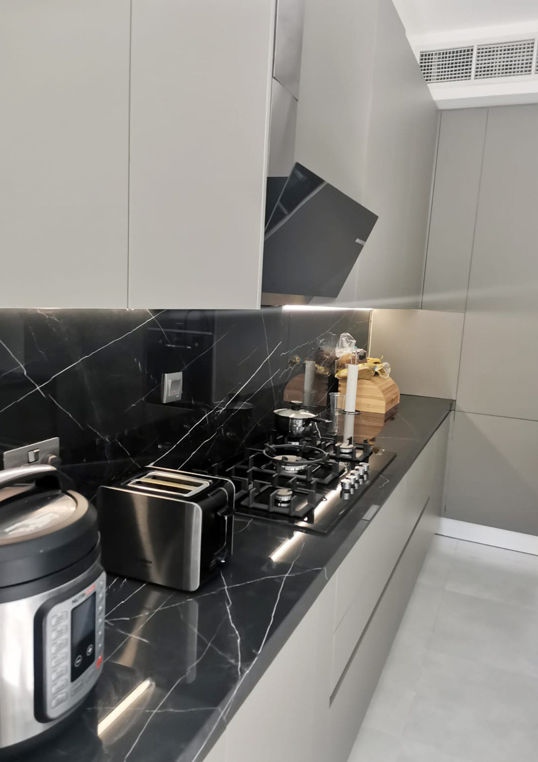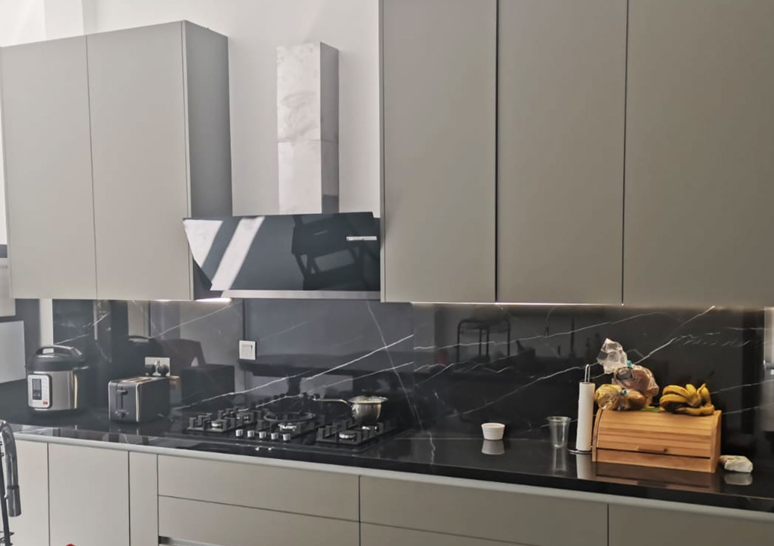 A modern kitchen that blends simplicity and style — featuring custom storage solutions for effortless cooking and personalized elegance.
