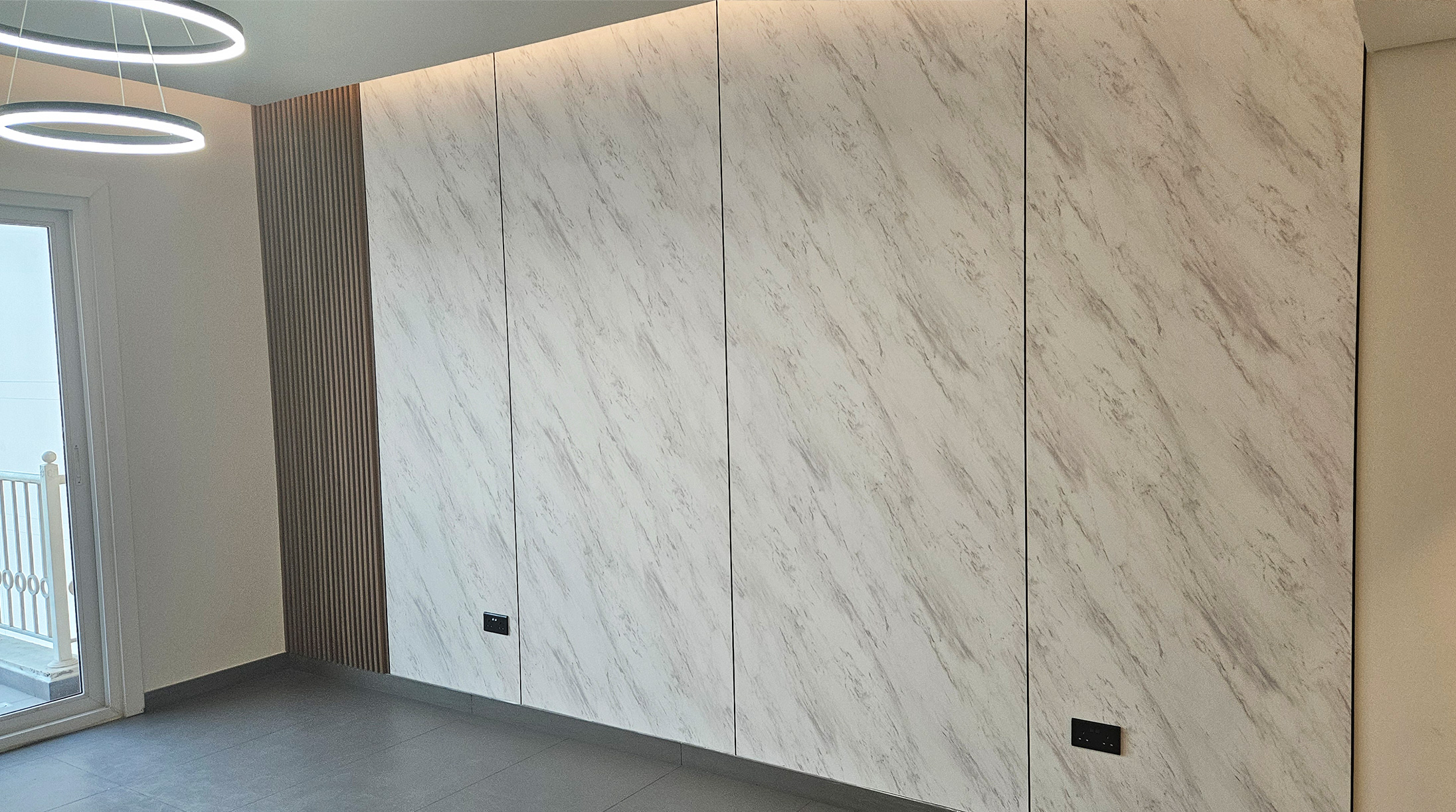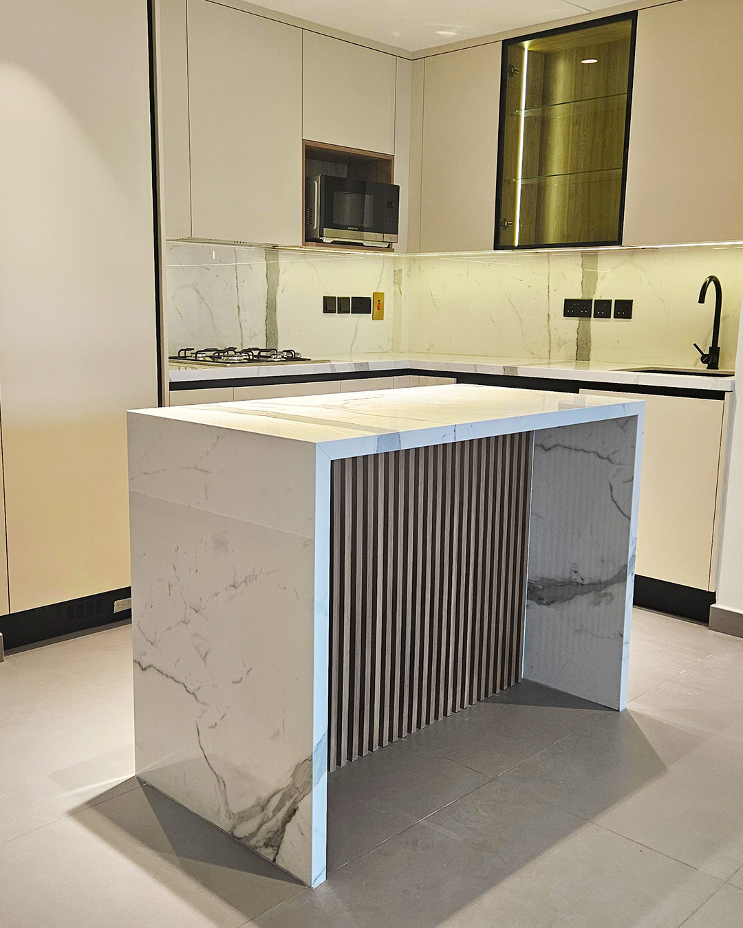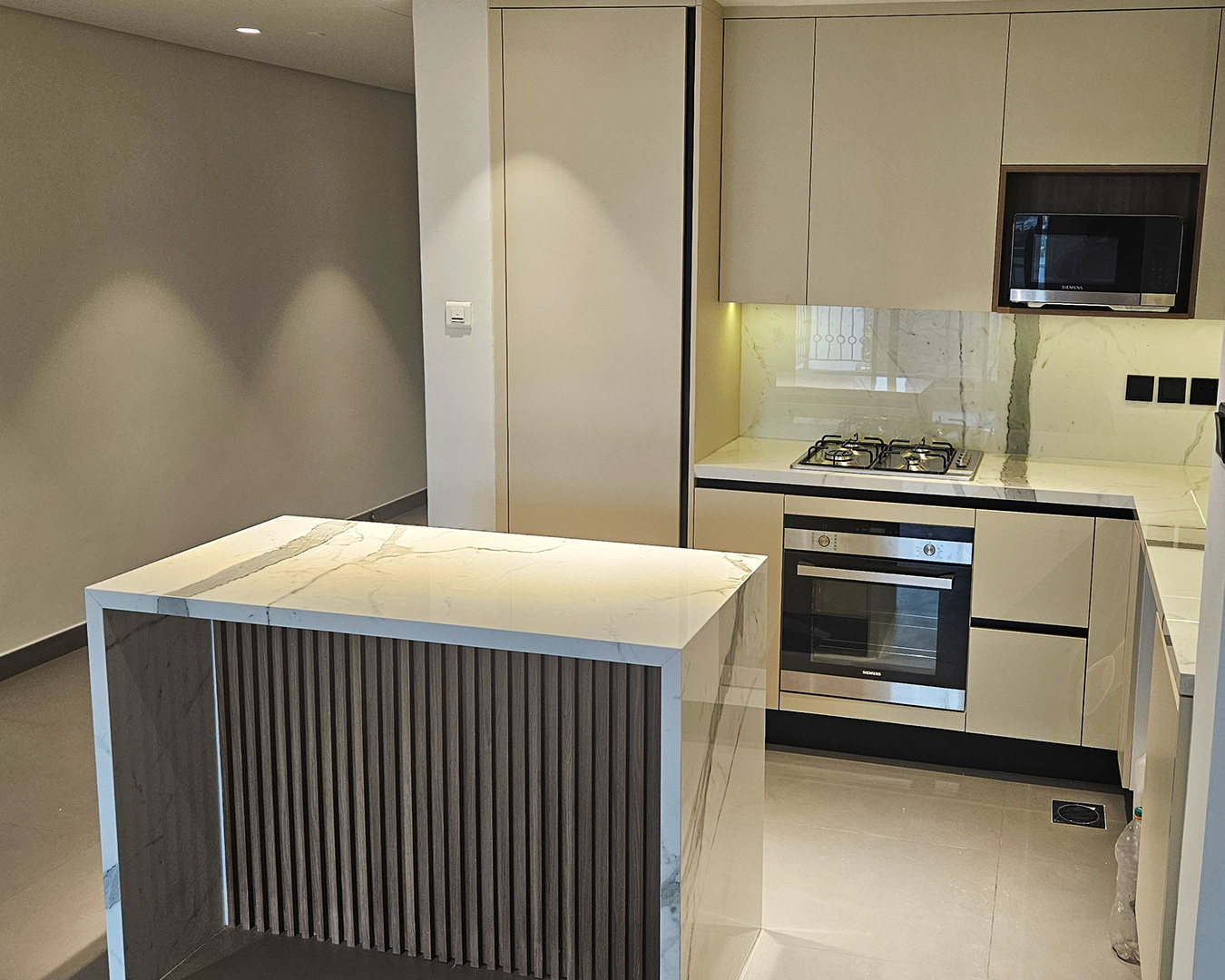Exquisite finishes define this minimalist kitchen and living space, featuring custom wardrobes, TV cabinets, vanities, modern lighting, and elegant wall panels — crafted for stylish, functional luxury