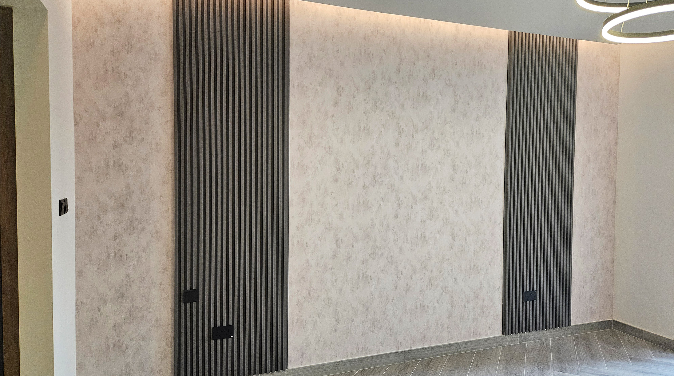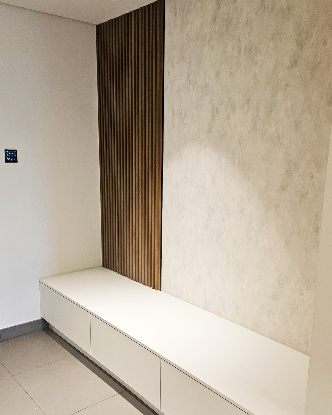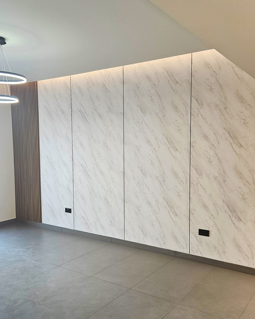 Exquisite finishes define this minimalist kitchen and living space, featuring custom wardrobes, TV cabinets, vanities, modern lighting, and elegant wall panels — crafted for stylish, functional luxury